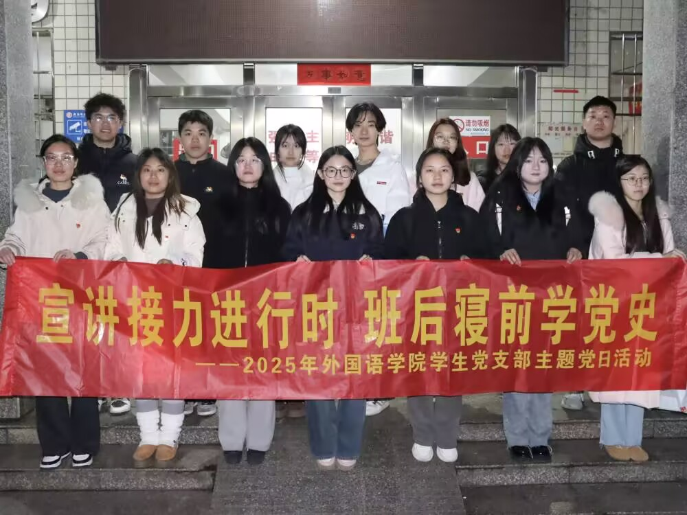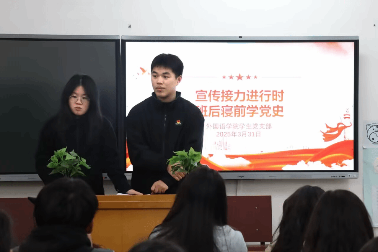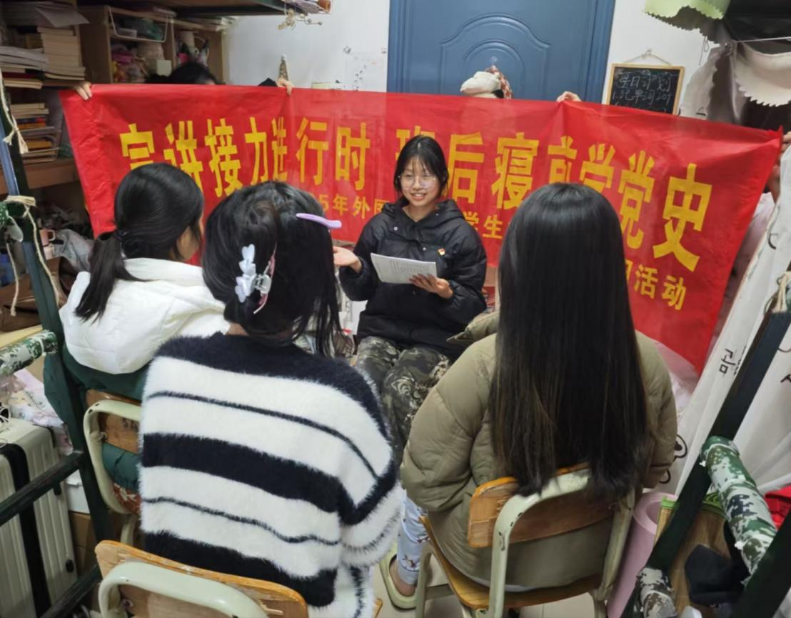 2024级各班自习室内,学生党员们通过精心准备的宣讲资料,系统讲述了中国共产党发展壮大的光辉历程。宣讲内容主要为党史发展历程和学校红色人物。另外党员们结合外语专业特色,重点介绍了党组织在对外交流、支教帮扶等方面的重要贡献,引发学生们的强烈共鸣。
