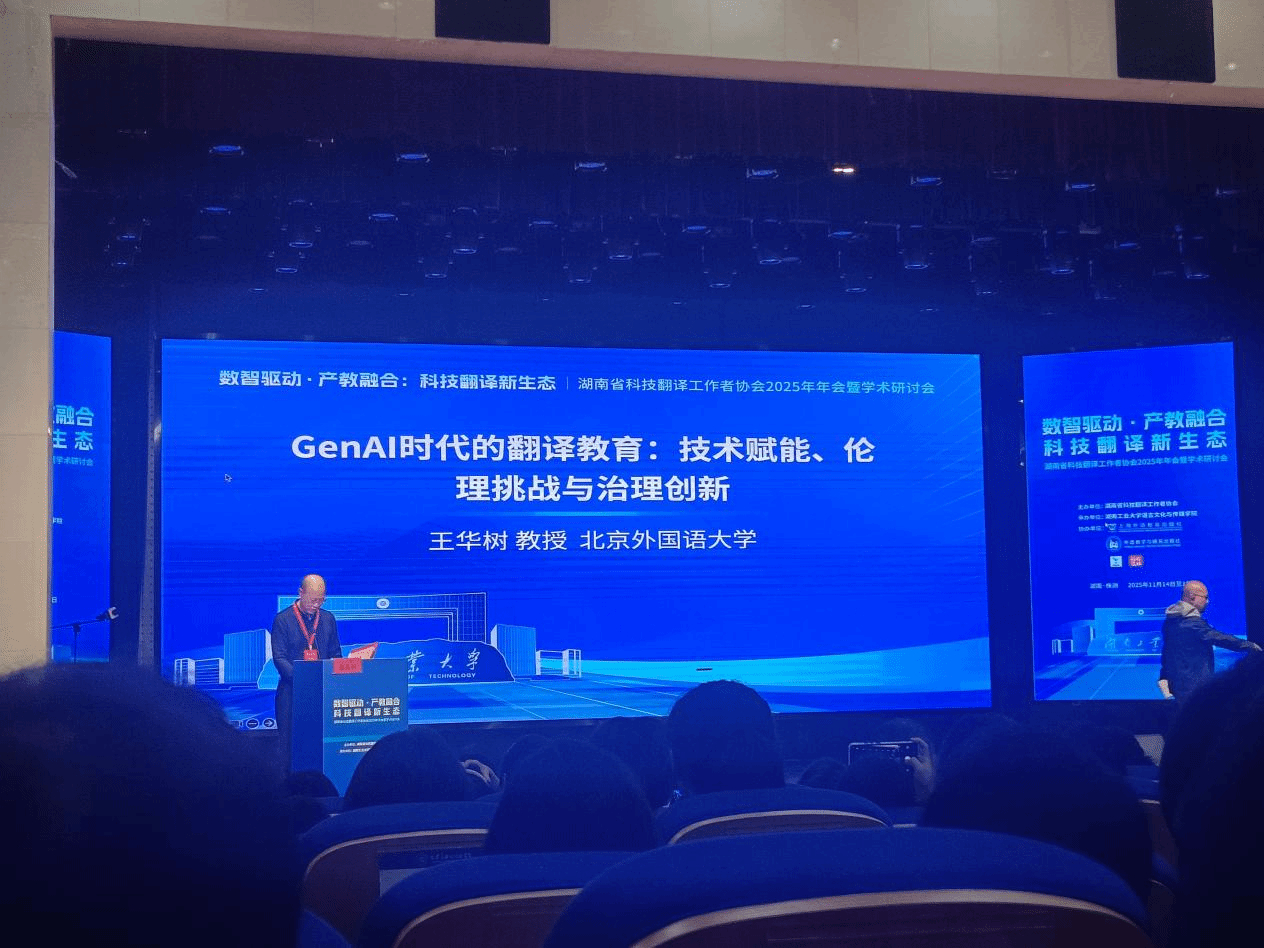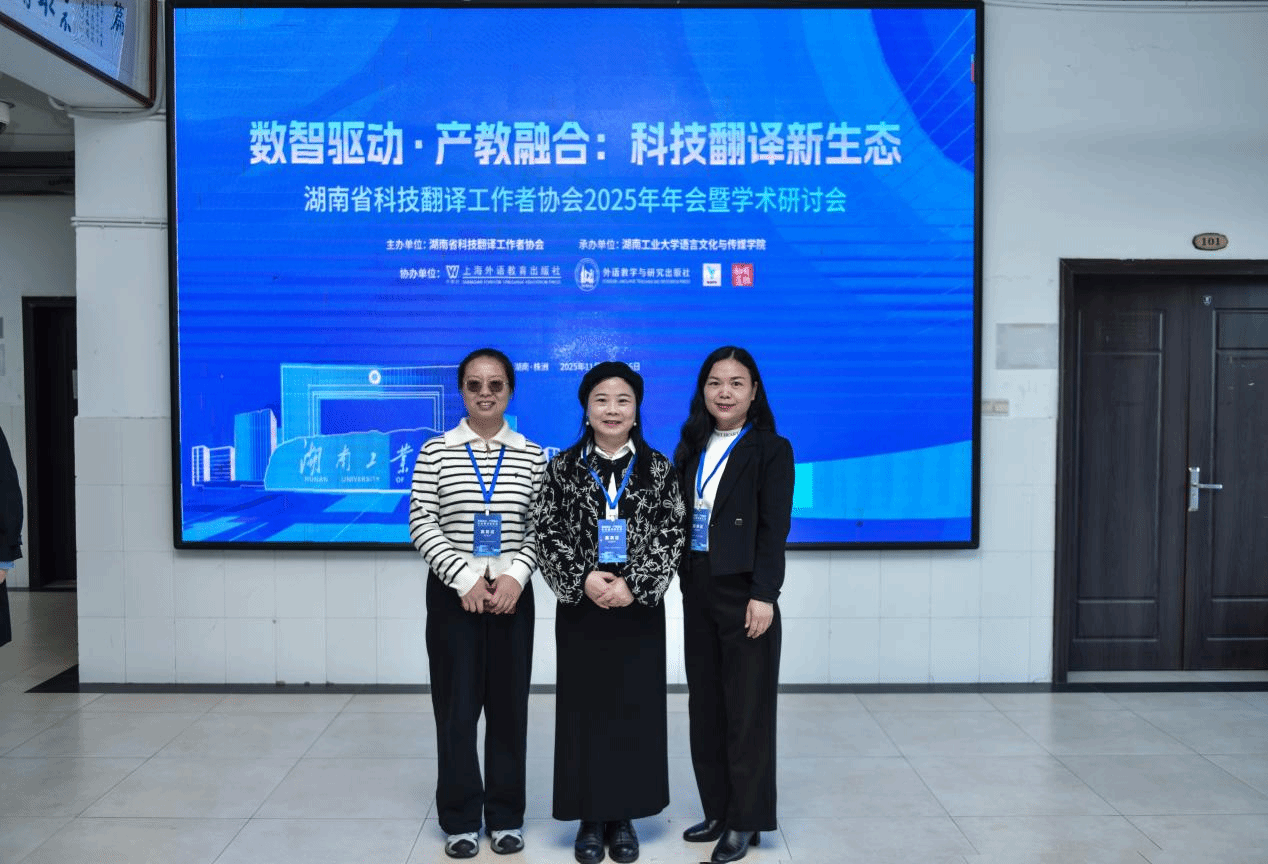 为深入贯彻国家数字化转型与产教融合战略部署,响应《“十四五”数字经济发展规划》中“推动数字技术与实体经济深度融合”的号召,同时呼应我院“课堂教学革命活动月”“促进人工智能与专业教学深度融合”的主题,聚焦科技翻译与语言服务创新核心议题,yL23411永利集团官网登录副院长何文娟及张敏、刘聪两位老师,于2025年11月14日至15日赴株洲,参加湖南省科技翻译工作者协会2025年年会暨“数智驱动·产教融合:科技翻译新生态”学术研讨会。本次会议由湖南省科技翻译工作者协会主办,湖南工业大学语言文化与传媒学院承办,上海外语教育出版社、外语教学与研究出版社等单位协办。